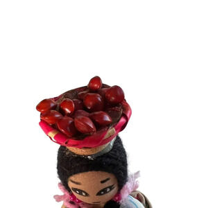 This charming homemade Honduran doll features a mother lovingly holding her baby, topped with a colorful basket of fruit on her head. Dressed in a long peasant-style dress with an apron, she is wrapped in a vibrant blanket. Her hair is neatly tied with a ribbon,