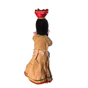 This charming homemade Honduran doll features a mother lovingly holding her baby, topped with a colorful basket of fruit on her head. Dressed in a long peasant-style dress with an apron, she is wrapped in a vibrant blanket. Her hair is neatly tied with a ribbon,