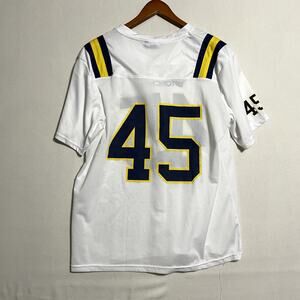 Synergy brand University of Central Oklahoma (UCO) Bronchos athletic jersey. This is a white mesh jersey with navy blue and yellow/gold accents on the shoulders and a large number "45" on the front and back. The front also features the word "BRONCHOS" and a special "UCO 125" patch. This patch indicates it was released in 2015, which was the year UCO celebrated its 125th birthday. The jersey is made from a lightweight, breathable mesh fabric, typical of performance sportswear. Great for game day, tailgating, or a collegiate sportswear collection.