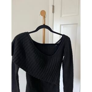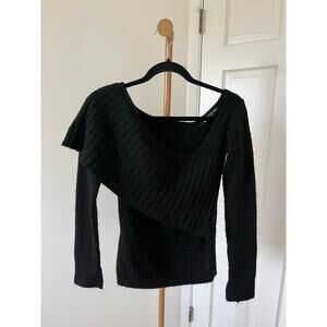 Black knit (98% Polyester, 2% Spandex). Sweater. Asymmetric neckline. Long sleeve. Pull-on. 22" from shoulder to hemline. Imported.
