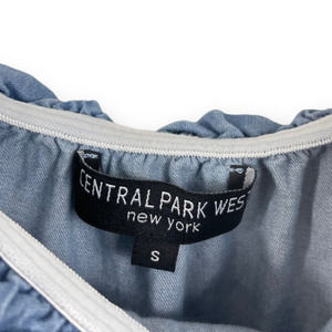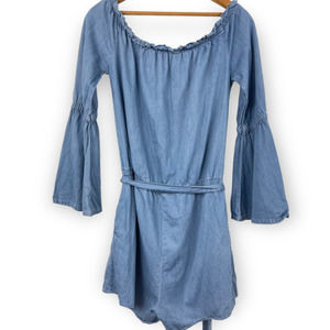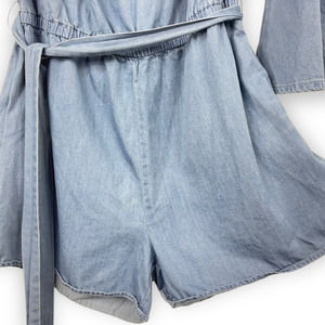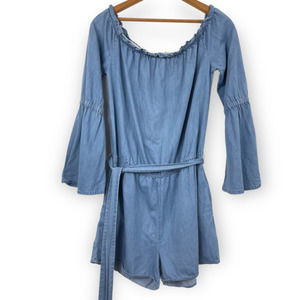 Stylish blue denim romper. Features bell sleeves and a belted waist. Perfect for casual outings.