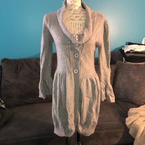 Structured through chest and then flares out; could possibly be buttoned and worn as a sweater dress
