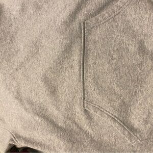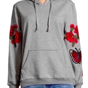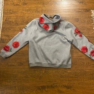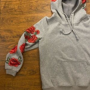 Stylish gray hoodie with vibrant red floral embroidery on sleeves. Features a drawstring hood and front pocket. Perfect for casual wear. 1st photo is stock photo not the actual- all other photos are the product you will receive.