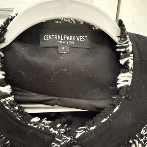 Elegant monochrome jacket with fringe accents. Perfect for a sophisticated look.