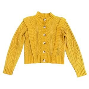 Yellow knit (60% Recycled Polyester, 40% Polyester). Sweater. Long sleeves. Crewneck. Front button closure. 20" from shoulder to hemline. Imported.