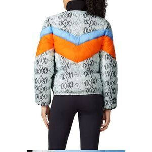 Central Park West Wesley Snakeskin Striped Print Puffer Coat Gray White Medium