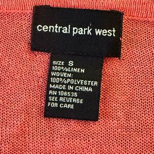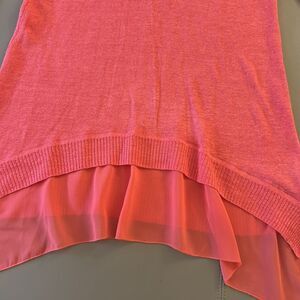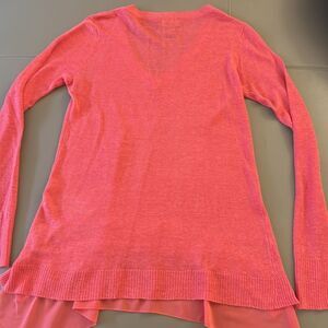 Central Park West sweater with sheer tonal overlay at hem, V neck, long sleeve in coral color.