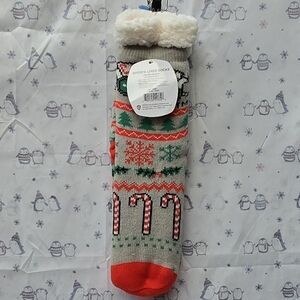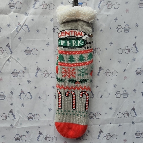 Festive Christmas stocking with Central Perk design. Features red, green, and gray colors.