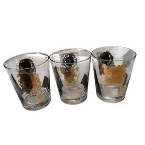 Cera International Black and Gold Coin Whiskey Mid-century Cocktail Barwar.. These glasses were designed by Bob Walleck for Cera international. They are from 1960-1969. The glasses are 4 inches tall and hold 12 ounces. There is normal wear and tear on these glasses with some loss of gold paint. See photos. Otherwise the glasses are in good condition for their age.