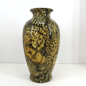 Ceramic African Safari Patchwork Vase Lions Leopards and Zebra 9 Inch Tall