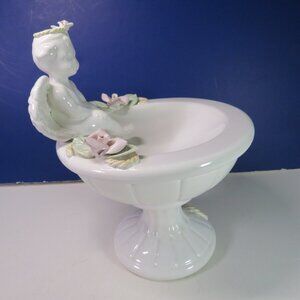 Ceramic Angel - Cherub sitting on Birdbath with floral accents 8.5" tall