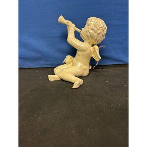 Ceramic Angel Figurine Playing Horn With Lamb & Gold Ribbon Wings