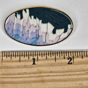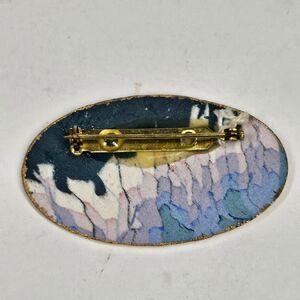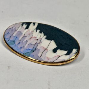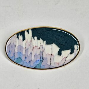 Vintage brooch, ceramic in an oval shape. Colors are white, purple, blue, and teal, in an abstract design. Gold trim around edge. About 2 wide. Unsigned. Good shape with minor surface wear.