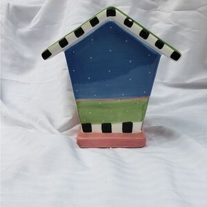 This 7" ceramic birdhouse features green and blue as the main colors, with black and white striped accents. There is slight discoloration on the top. The only sign of wear is on the very bottom, where the velvet lining has worn off the front perch. #birdhouse #ceramic