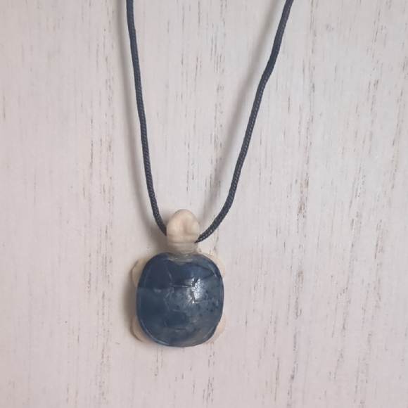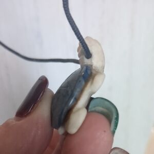Cute costume, handmade ceramic turtle charm hung on a black rope. Unknot to wear or leave as is to hang elsewhere. Purchased at an eclectic bead shop! The ceramic turtle (2"long/1 1/2"w) is blue on top and cream under body, the strung rope (9 1/2" long) and is black. Unique piece/fragile. Will include an organza pouch when shipped. 🐢💙