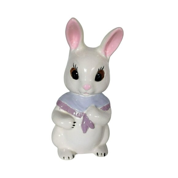 Ceramic Bunny Rabbit Figurine, Lavender Scarf & Pink Ears, Vintage Easter Decor