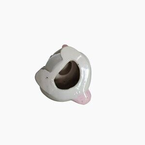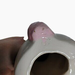 This charming hand painted ceramic bunny figurine captures a timeless elegance with delicate hand-painted lavender and pink accents. Signed on the underneath by the maker. Standing approximately 6.5 inches tall, this collectible is a delightful decorative piece. Its big eyes and pastel color scheme evokes a sense of retro nostalgia, making it a lovely addition to any curio cabinet or seasonal Easter décor arrangement.