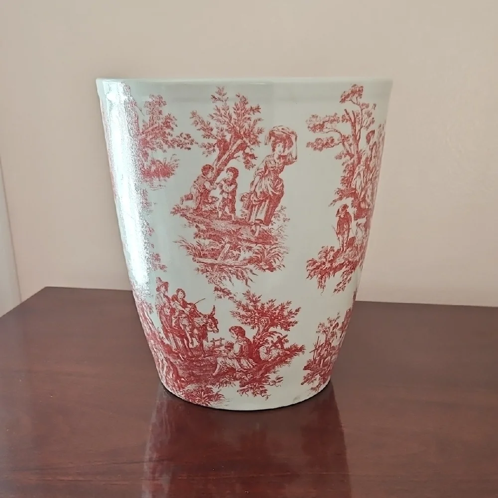 Ceramic container. Eight inches tall, with soft red Toile de Juoy pattern. item is for decor use only, marked as not food safe.