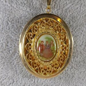 *Description: This is a beautiful gold plated locket with a ceramic print, cameo style, on a 23 inch chain from the 1960s. The locket is large and has a photo inside which could be used as a template for both sides of the locket to add photos of your own. The locket and chain are in excellent condition with only tiny signs of wear. The opening and snap closed clasp work great. This would be a great addition to your vintage jewelry collection or make a great vintage gift!