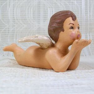This ceramic angel is 4 1/2 inches long, 3 inches wide at the wings, and 2 1/2 inches tall. He was slip cast and painted with acrylic paints for a matte finish. This cherub figurine has brown hair and brown eyes and is lying on his tummy blowing a kiss. His wings have a pearl finish.