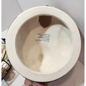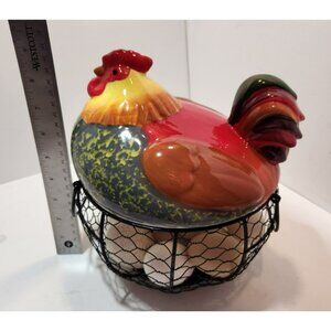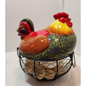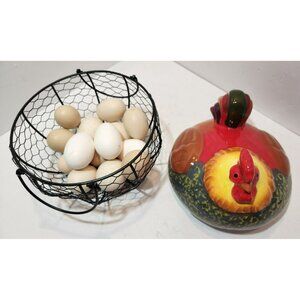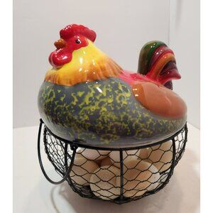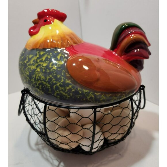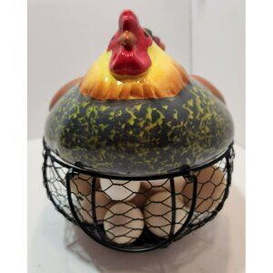 This Ceramic Chicken Sitting on Black Metal Egg Basket with Eggs is a charming farmhouse decor piece perfect for any room. The medium-sized basket features a rustic country style with a metallic finish, making it a unique addition to your collection. The chicken sitting on top adds a playful touch, while the eggs inside give it a functional aspect. Made of ceramic and metal, this 2008 manufactured piece from Home Decor is sure to be a conversation starter in your home. Pre-owned by collector. In good condition with no chips or cracks. Please see pictures for details.