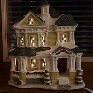Ceramic Christmas Village House Decoration Yellow House Victorian Lighted Snow