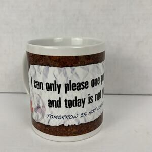 Ceramic Coffee or Tea Mug. White. Cork board background with "I Can Only Please One Person Per Day and Today Is Not Your Day. Tomorrow is not looking good either." printed on white paper tacked to the corkboard.