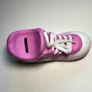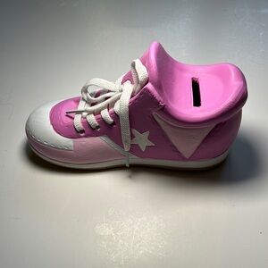 This Ceramic Sneaker Coin/Money Box features a vibrant two-tone pink design with a striking white star logo on the side. The white laces and midsole add a classic touch to the playful color scheme