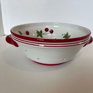Two Handled Ceramic Colander decorated with red cherries with green leaves and stems. Diameter 10.25in H 4.25in. Excellent condition.