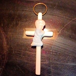 Ceramic Cross /W Blue Praying Boy On A Hook Hangs Above Childs Bed