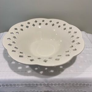 Pretty perforated, scalloped ceramic bowl for showcasing treasures from shells to dried petals or just as a catchall on a front hall table. A perfect way to keep a candle or reed oil off your furniture! An ideal spot to display holiday decor and the perforations look pretty with ribbon looped through to pull seasonal colors together! Or create an amazing dining room centerpiece or focal point for the counter-top or coffee table. Creamy off-white color blends with all decor. 11” diameter