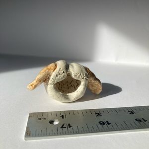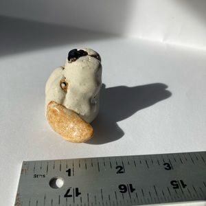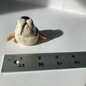 Hand sculpted ceramic dog head. Can be displayed on the wall, table top, shelf or cabinet. Approximately 1 inch high and 2 inches wide.