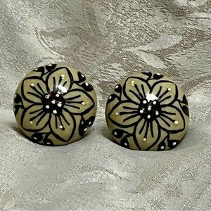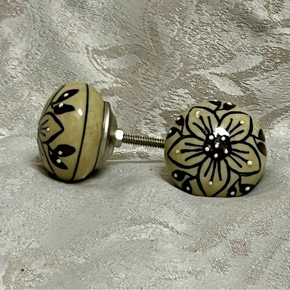 Glazed ceramic drawer pull set with floral design. Color: black, white, and burgundy(center of flower and leaves) on natural/tea stained background and silver colored metal accents. White spots are slightly textured.