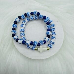 Ceramic Floral mix Beaded & Cross Stretch Bracelet Duo