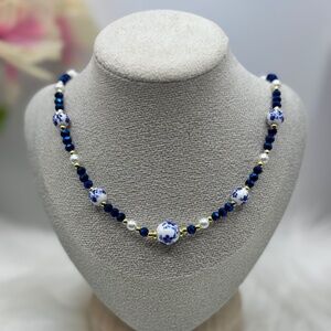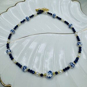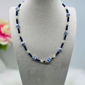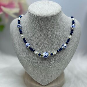 Beautiful blue theme beaded necklace with Ceramic floral beads