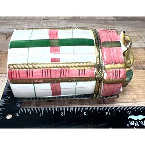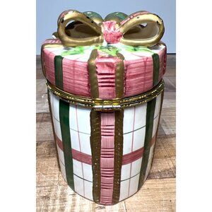 This ceramic jar is designed to resemble a beautifully wrapped gift box, complete with a bow on top. Its charming pattern and festive colors make it a stylish addition to any space. Ideal for both decorative use and practical storage, it brings a touch of elegance to your home decor. Touched Up