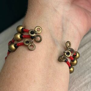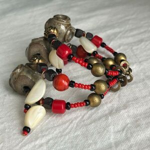 Repurposed vintage ceramic beads with cream iridescent shell beads. Gold red and black modern accent beads. I have a 7” wrist for an idea of size size. Due to the wire’s flexibility it should fit over 7” wrist, leaving a wider gap on the inside of the wrist. Fun bold chunky boho world travel vibe.