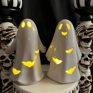 Ceramic Halloween Spooky Season Light Up White Ghosts W/ Bat Cutouts x2