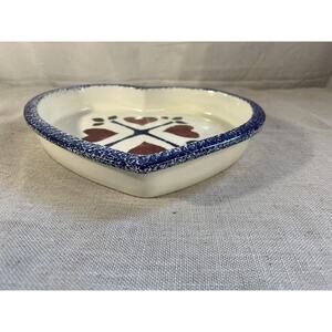Ceramic Heart Baker White Red Blue Spongeware Serving Dish Flat Earth Clay Works