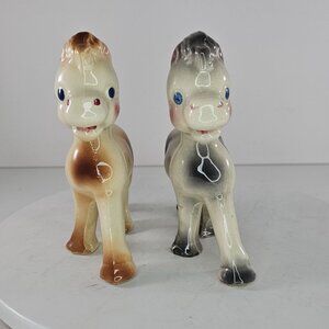 Charming ceramic horse figurines in brown and gray tones offer a vintage aesthetic. Ideal for collectors or as decorative accents in any space.