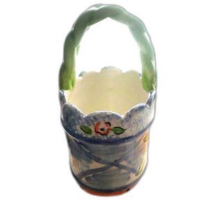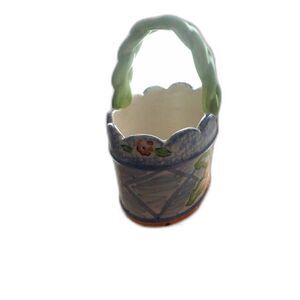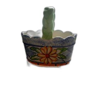 This is a beautiful hand-painted basket and is an oval shape. The handle is painted light green and is braided. The overall background color is blue and has a large yellow flower on both sides of the basket. The rim of the basket is a scalloped design. The leaves are green with white and around the bottom of the basket is painted orange with black dots. It measures 5" long x 4" tall and the inside measures 2.5".