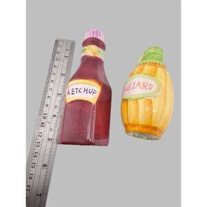 set of ceramic salt and pepper shakers designed to look like ketchup and mustard condiment bottles, complete with faux spills at their base. These novelty shakers are a playful kitchen or dining accessory, featuring distinct red "ketchup" and yellow "mustard" bottles, each with an opening for dispensing salt or pepper. Excellent Condition