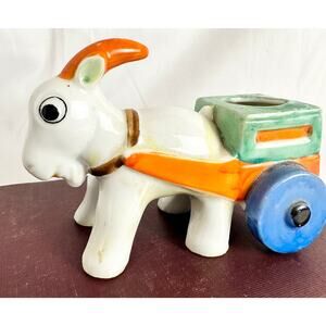 Add a touch of vintage charm to your sewing space with this delightful Lusterware goat and cart pin cushion! Made in Japan, this unique piece features a beautifully detailed goat pulling a cart, all finished in a lovely lusterware glaze.