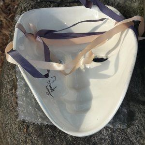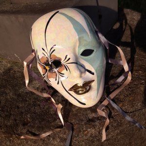 Ceramic Masquerade Masks Wall Hanging Decor Glass Art Face Mask Mardi Gras Fat Tuesday Drama Harlequin Makeup Masks. Artist Signed Piece by 'Jack Hagan' on back. Includes Ribbon for Hanging on wall. Metallic Gold Lips and Teal Ornate Eye Designs. A lovely Boho Decor Accent for any room or wonderful gift idea for mom, girlfriend or sister. 7 tall X 5 wide X 2 1/2 inches deep