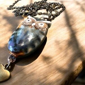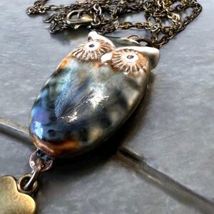Owl necklace. Ceramic owl pendant necklace. Owl jewelry. Owl pendant. Do you love owl? Know someone who loves owls? Us too!! This adorable little ceramic owl pendant necklace is just the perfect gift for you. Strung on a 24” chain with a lobster clasp. It’s original and beautiful. Take care of your jewelry and it will gleam for years.
