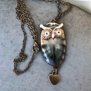 Ceramic Owl Pendant Necklace with Heart Charm Owl necklace. Ceramic owl pendant