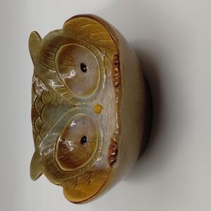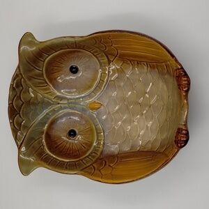 Ceramic Owl Shape Bowl 7.5 x 9.5 x 2.5 tan and blue serving bowl