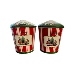 These great salt and pepper shakers have a tapered, round shape. There is a Christmas tree scene on both sides with the word "Joy" above the picture.