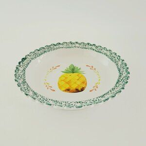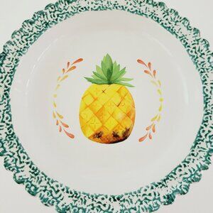 This charming vintage ceramic plate from ABC Distributing features a vibrant pineapple design, surrounded by a delicate green patterned border. A delightful addition to any classic kitchen decor.