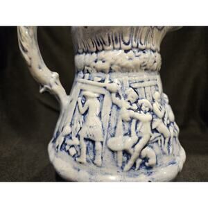 This ceramic pottery pitcher jug is based on the poem "Tam O'Shanter" and features relief molded scenes from the poem, including Tam O'Shanter and Souter Johnnie carousing in a tavern. It features a blue color with a tavern theme. Hand-painted with raised relief details, this vintage piece was handmade in the 1960s using art pottery techniques. Standing at 6.25 inches tall and 5 inches wide, this unmarked brand pitcher jug is a unique and artistic addition to any collection of decorative cookware or dinnerware. We take pride in safe packaging our sales.